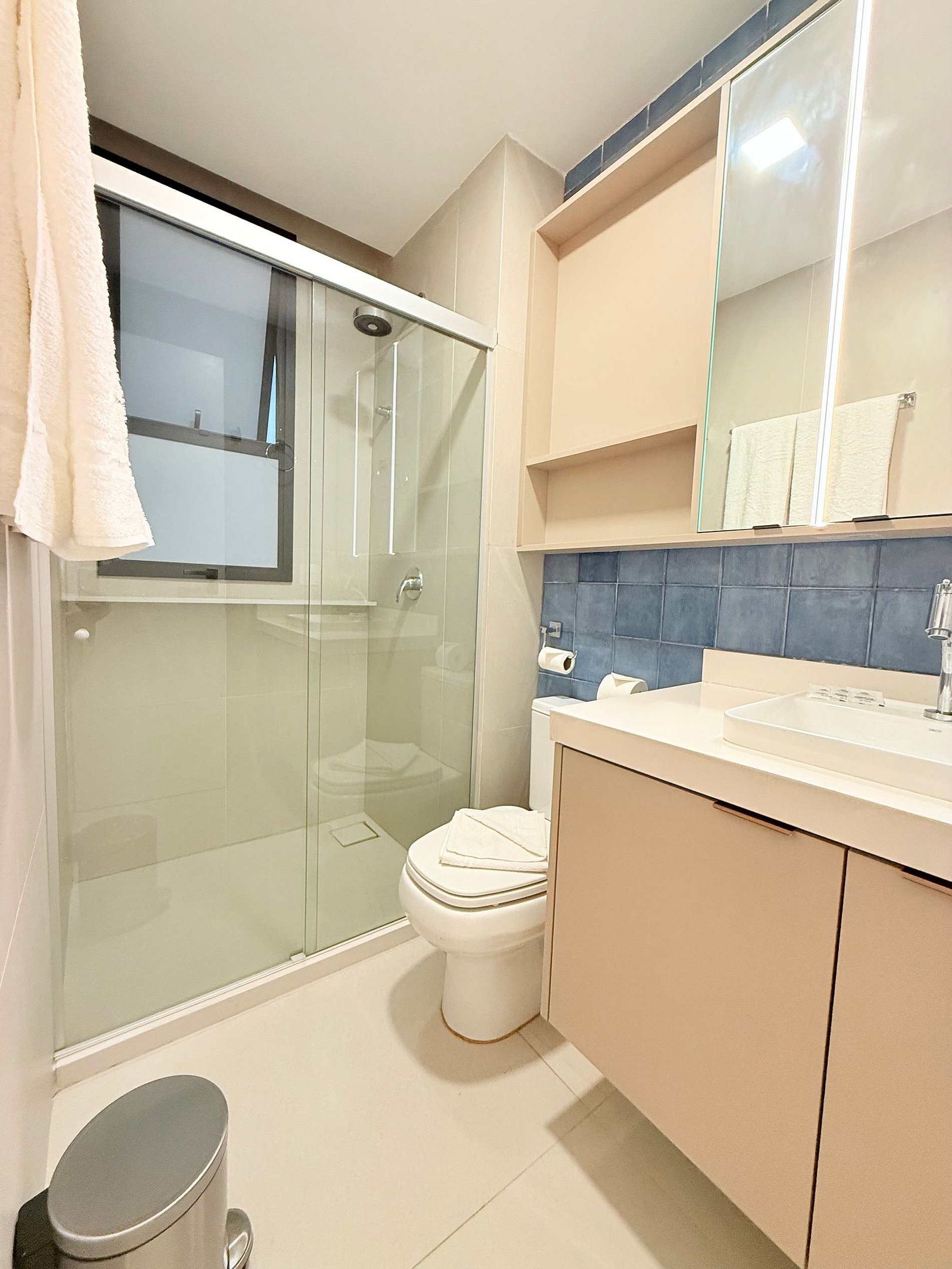 A cozinha é completa, equipada com todos os utensílios, eletrodomésticos e itens essenciais para quem gosta de cozinhar ou apenas deseja se sentir em casa durante a estadia. O banheiro é moderno, bem iluminado e decorado com muito bom gosto, oferecendo praticidade sem abrir mão do estilo.