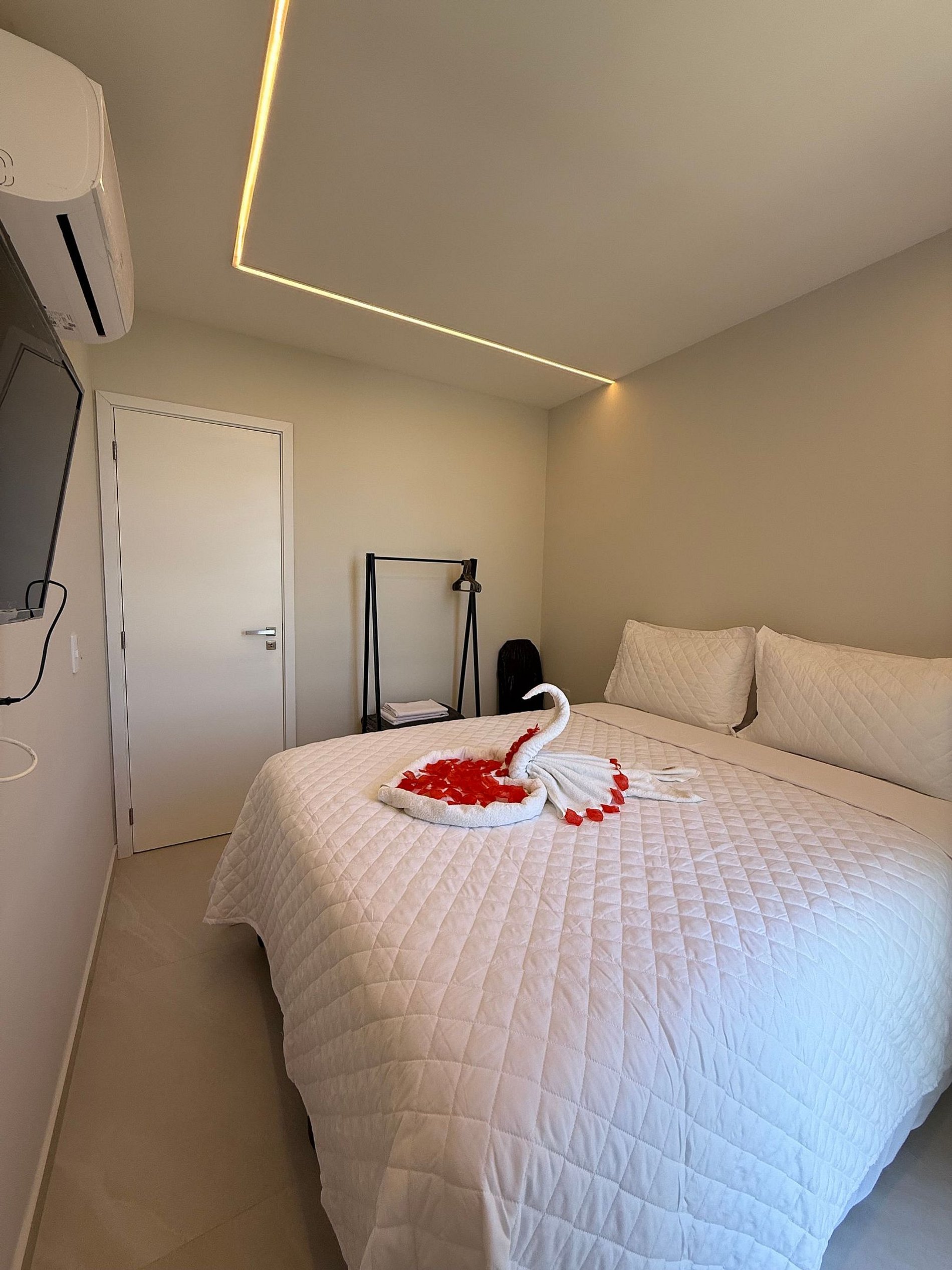 Conta com um quarto com cama queen, sala integrada adaptável, cozinha completa e ar-condicionado em todos os ambientes.