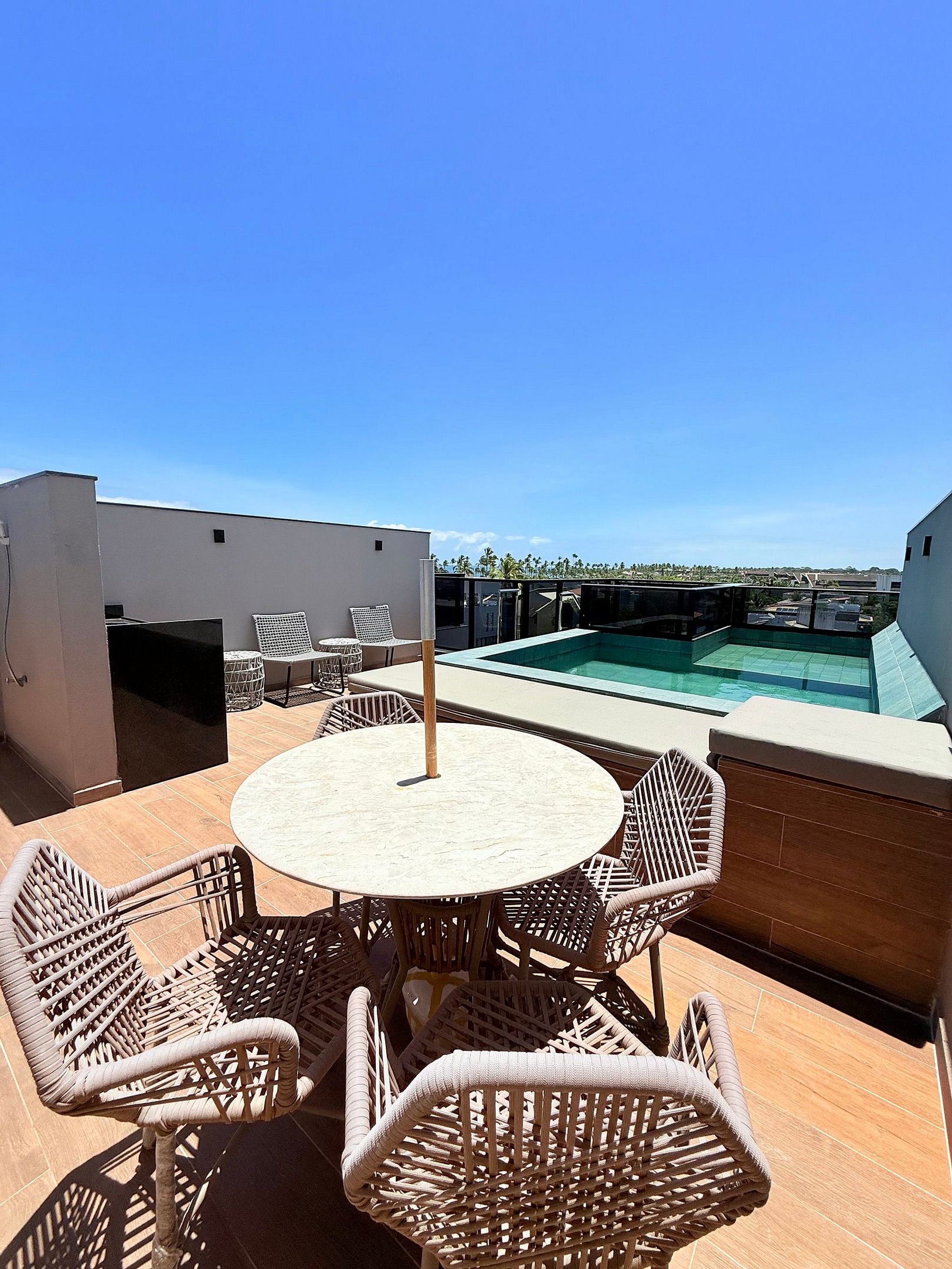O grande destaque é o rooftop privativo, com piscina exclusiva, mesa e guarda-sóis — ideal para curtir com estilo e liberdade.