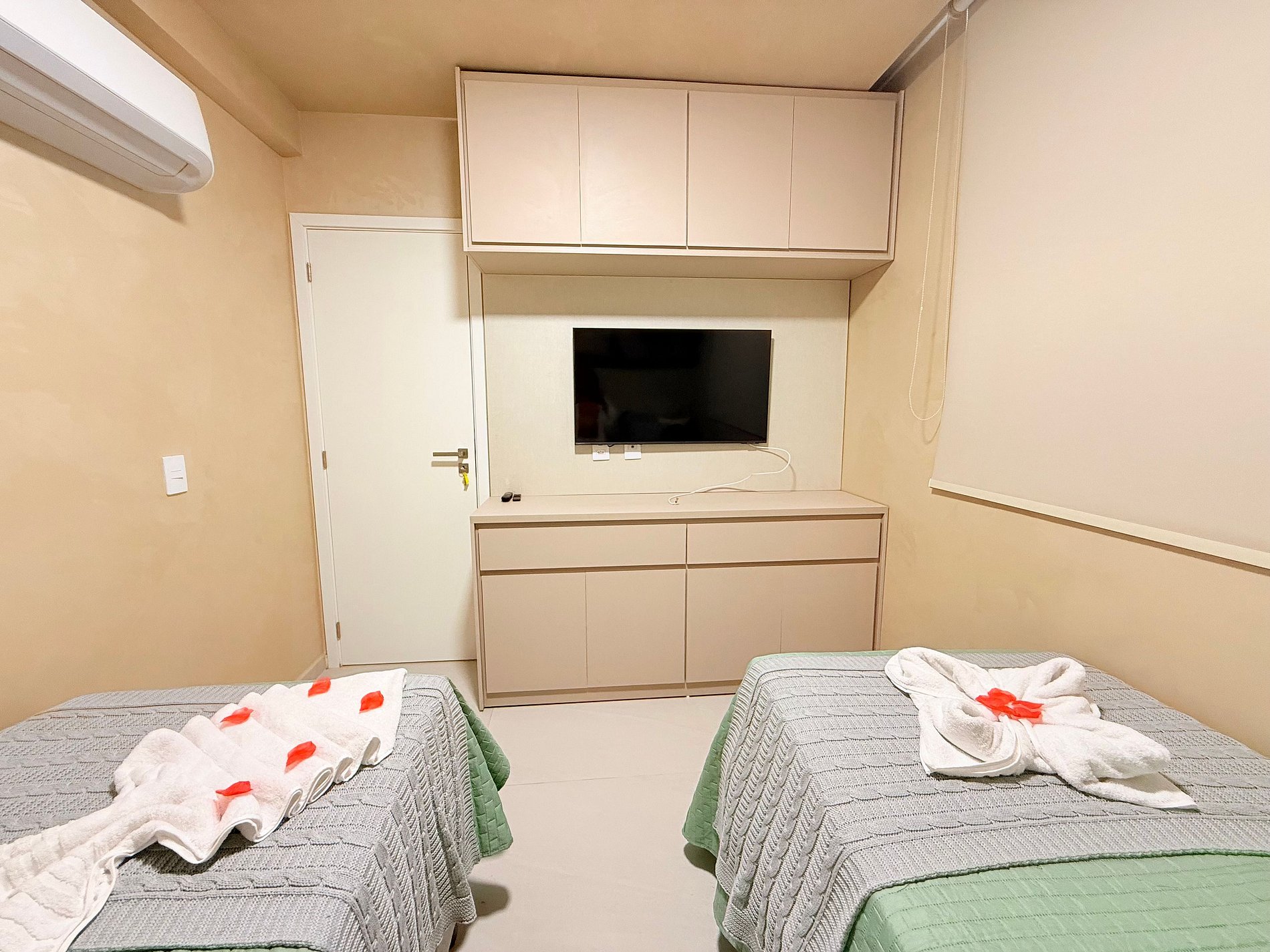 Apartamento novo, possui 2 dormitórios sendo um deles suíte oferecendo total conforto. todo equipado com utensílios e eletrodomésticos modernos e de excelente qualidade. Ar Condicionado nos quartos e sala. Acomodamos até 6 pessoas. Temos na suíte uma cama queen confortável e no quarto social duas camas de solteiro, um sofá cama na sala. Temos cozinha completa e equipada, nossa varanda com mesa gourmet com 6 lugares . Tudo isso para ser usufruído durante sua estadia.