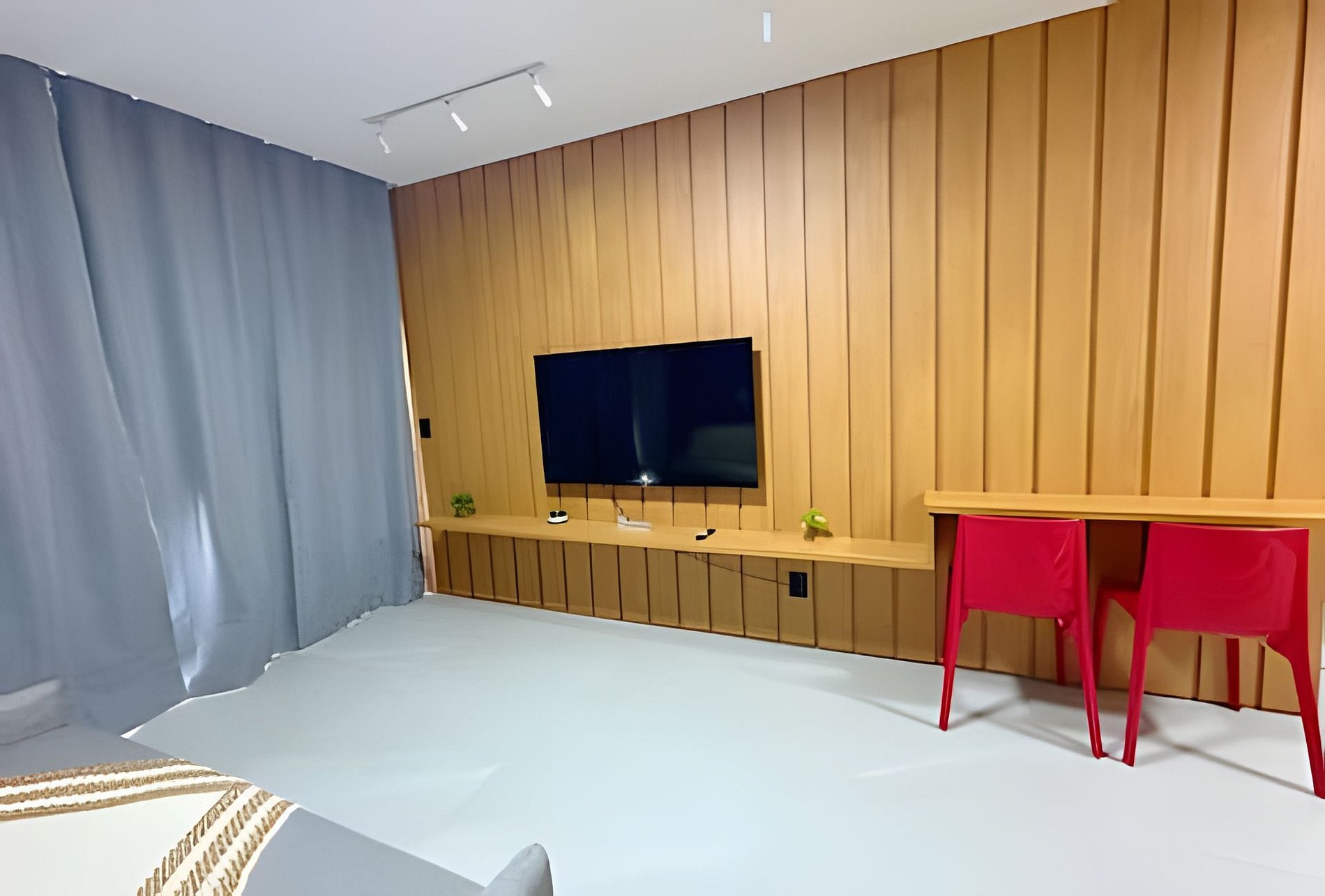 O imóvel conta com uma sala ampla e aconchegante com sofá-cama de casal, um quarto com cama queen (suíte com banheiro privativo) e um segundo quarto com duas camas de solteiro, sendo uma delas bicama. São dois banheiros no total, proporcionando mais praticidade para os hóspedes.
