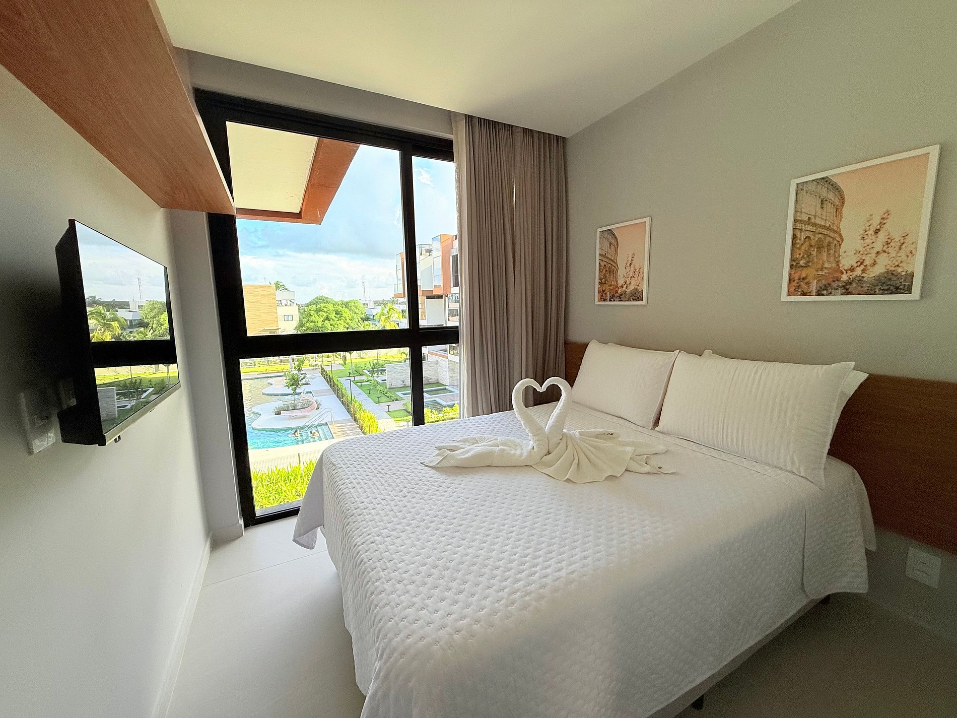 A sala é ampla, bem decorada e aconchegante, com um sofá-cama de casal que, quando aberto, transforma o ambiente em um segundo quarto. A cozinha é moderna e completa, com todos os utensílios e eletrodomésticos necessários para o dia a dia. O banheiro é funcional e elegante, e a varanda é um verdadeiro convite ao relaxamento, com vista agradável e clima tranquilo.