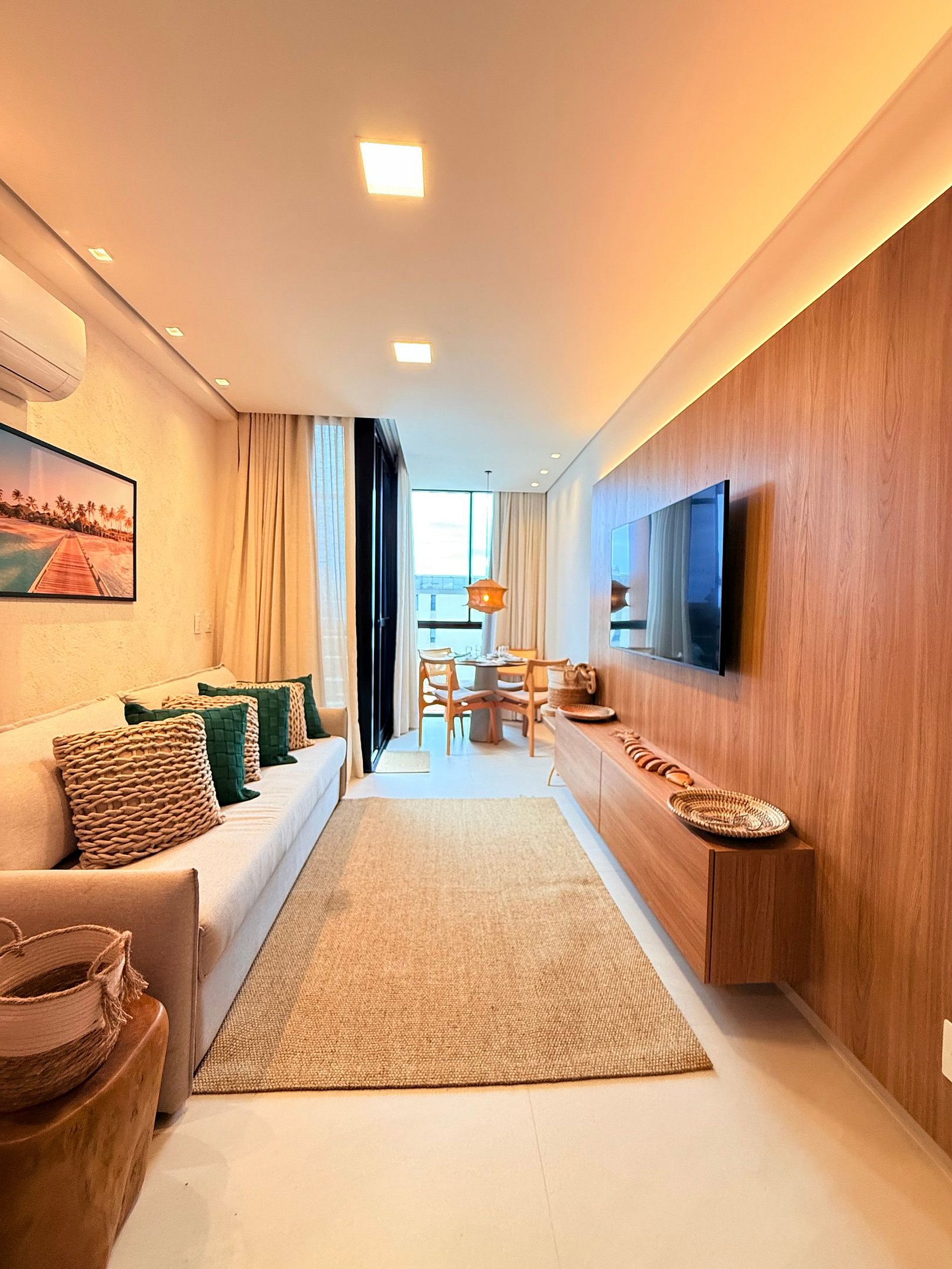 A sala de estar é integrada, confortável e pode ser facilmente adaptada para acomodar mais hóspedes com charme e praticidade.