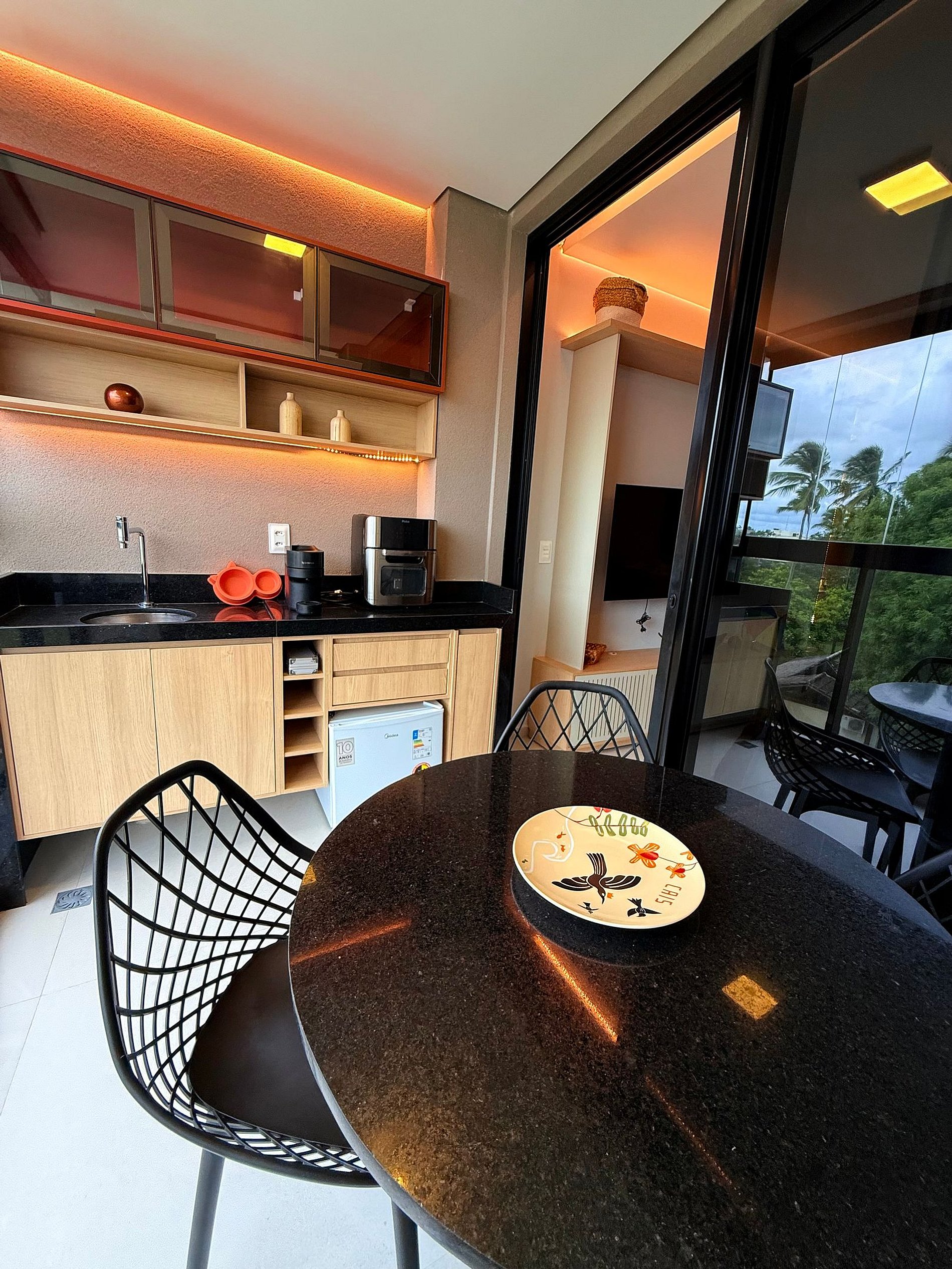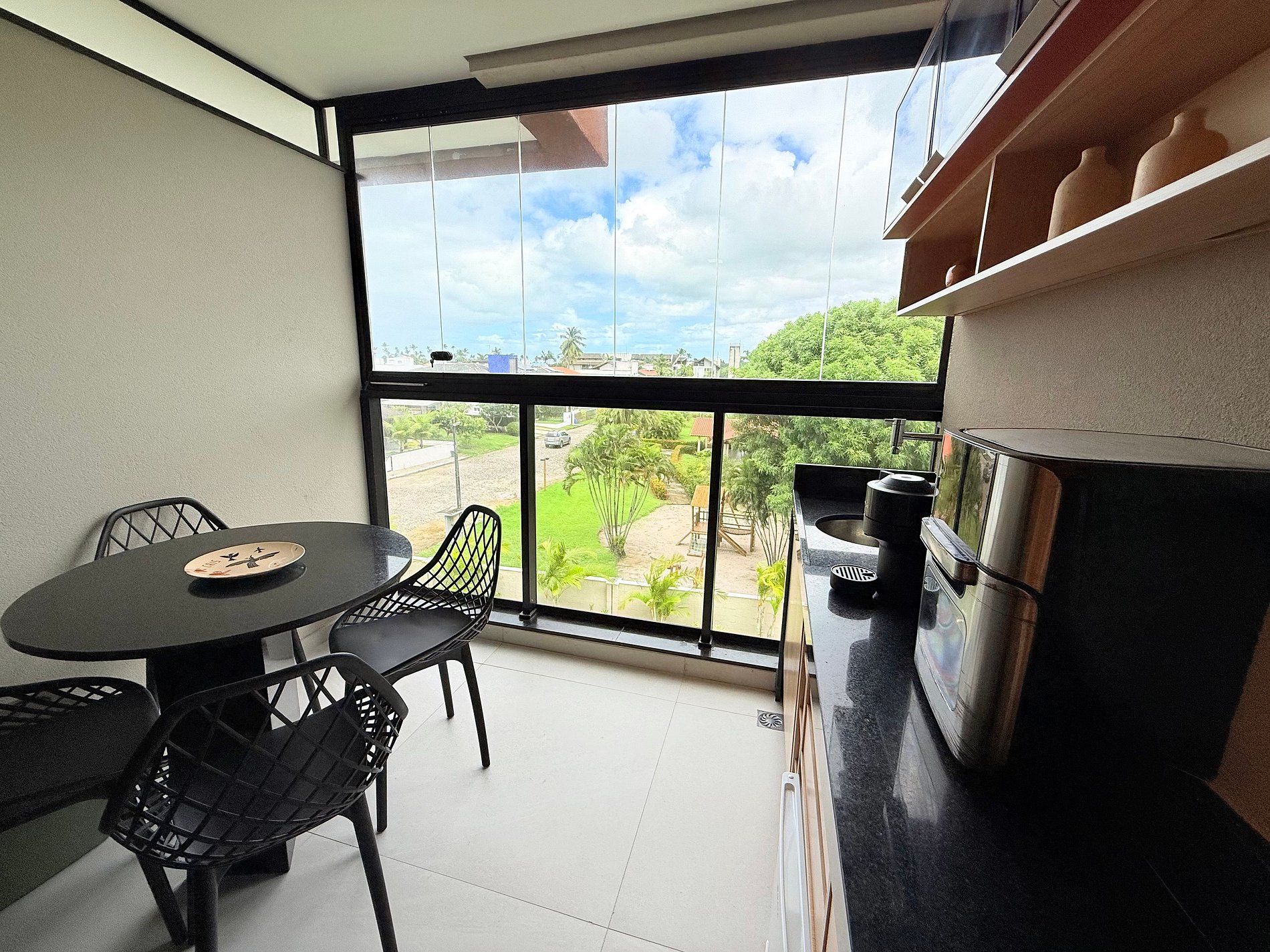 A varanda,, é o espaço perfeito para momentos de tranquilidade ao ar livre. O apartamento está situado em um resort pé na areia, com infraestrutura de alto padrão, incluindo piscina, restaurante, academia e muito mais. Um verdadeiro paraíso para quem deseja relaxar com conforto, em um ambiente de luxo e exclusividade.