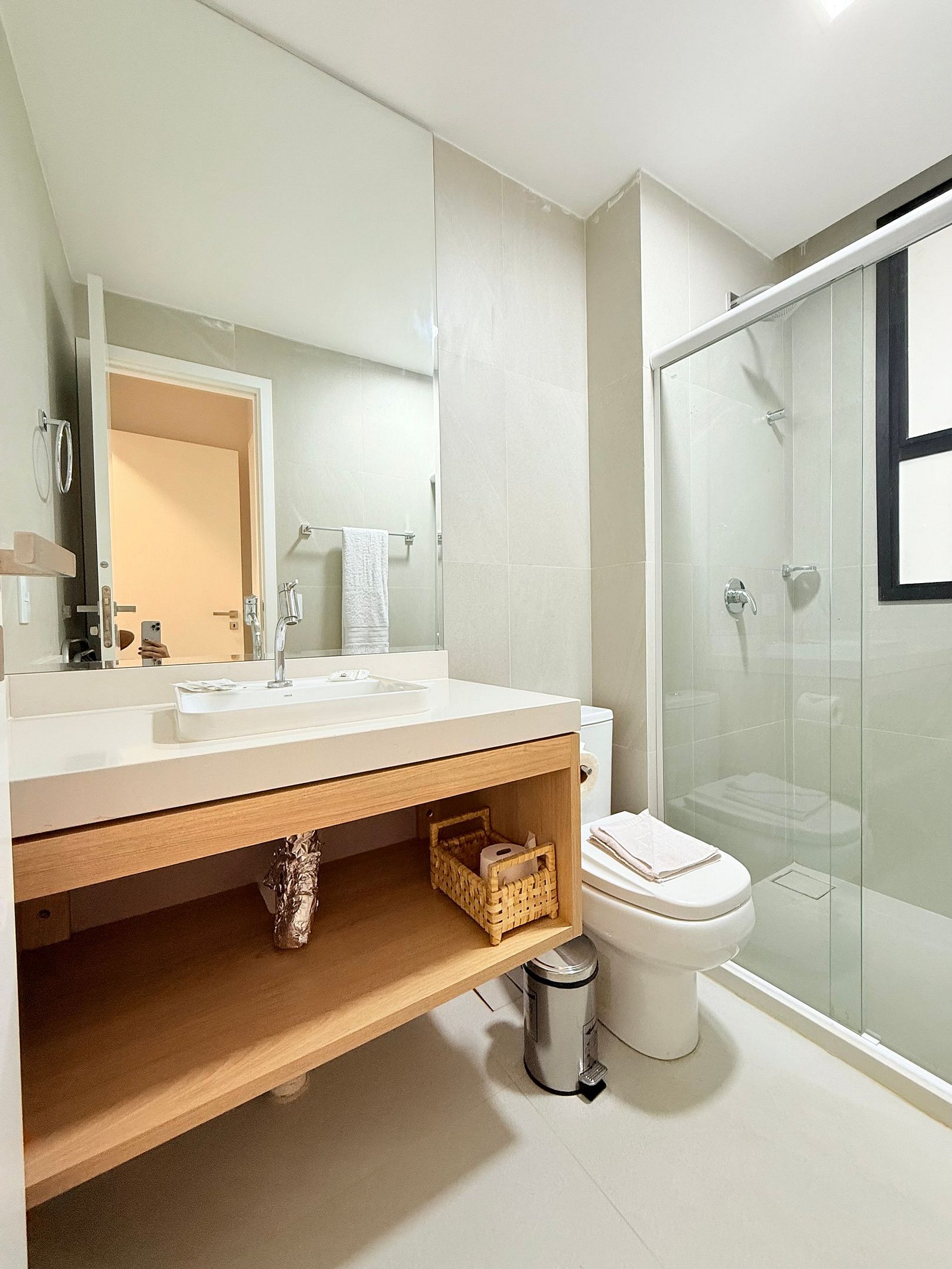 O imóvel conta com uma sala ampla e aconchegante com sofá-cama de casal, um quarto com cama queen (suíte com banheiro privativo) e um segundo quarto com duas camas de solteiro. São dois banheiros no total, proporcionando mais praticidade para os hóspedes.